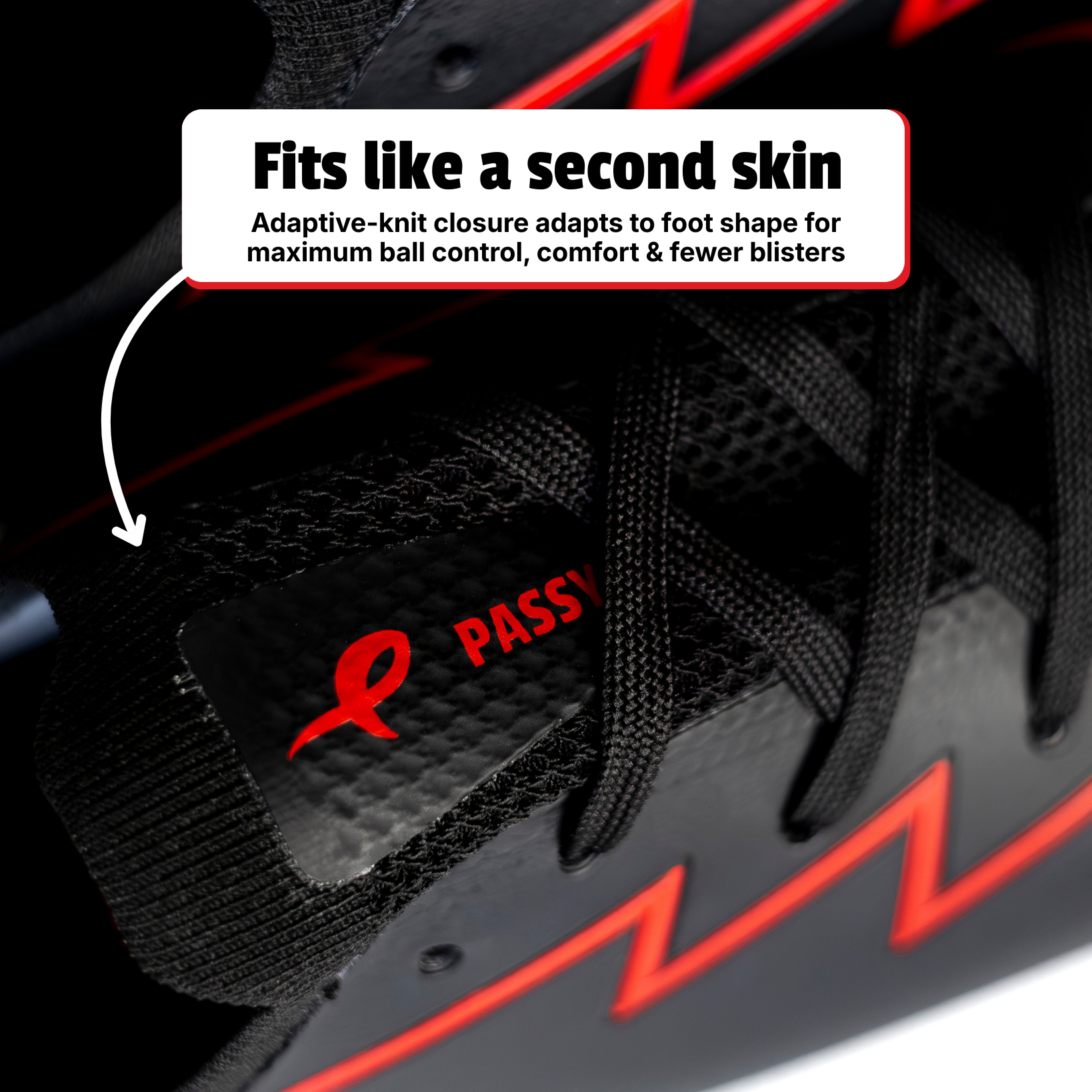 Onze adaptive-knit sluiting vormt zich nauw om je voet, zodat je maximale balcontrole en precisie ervaart. Geen schuiven, minder blaren en een natuurlijk gevoel alsof de schoen een verlengstuk van je voet is.